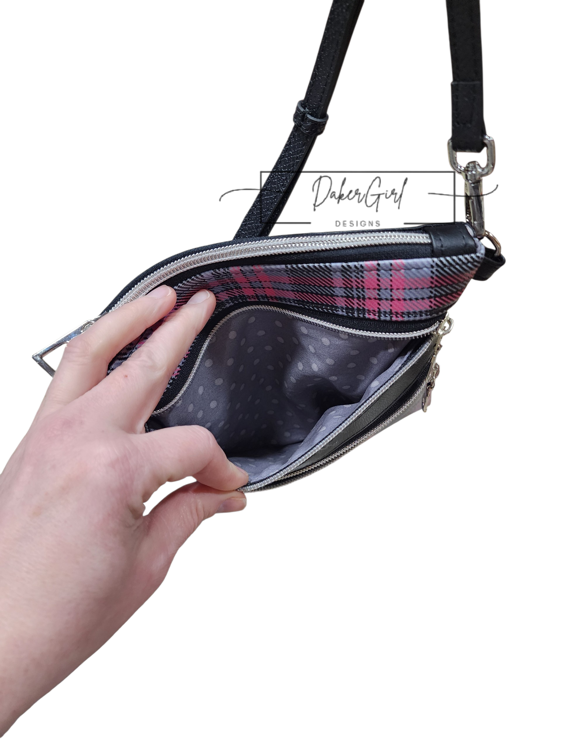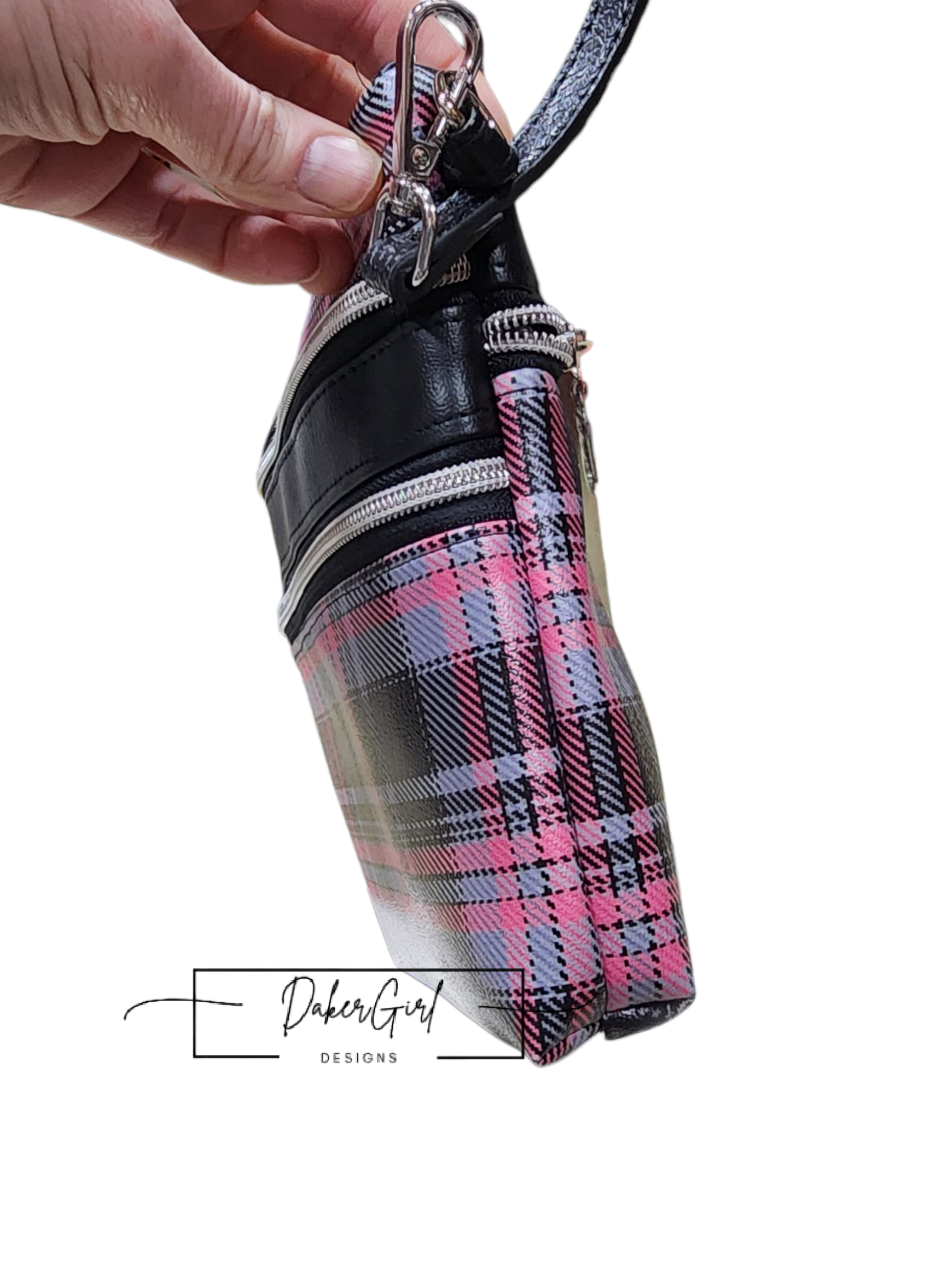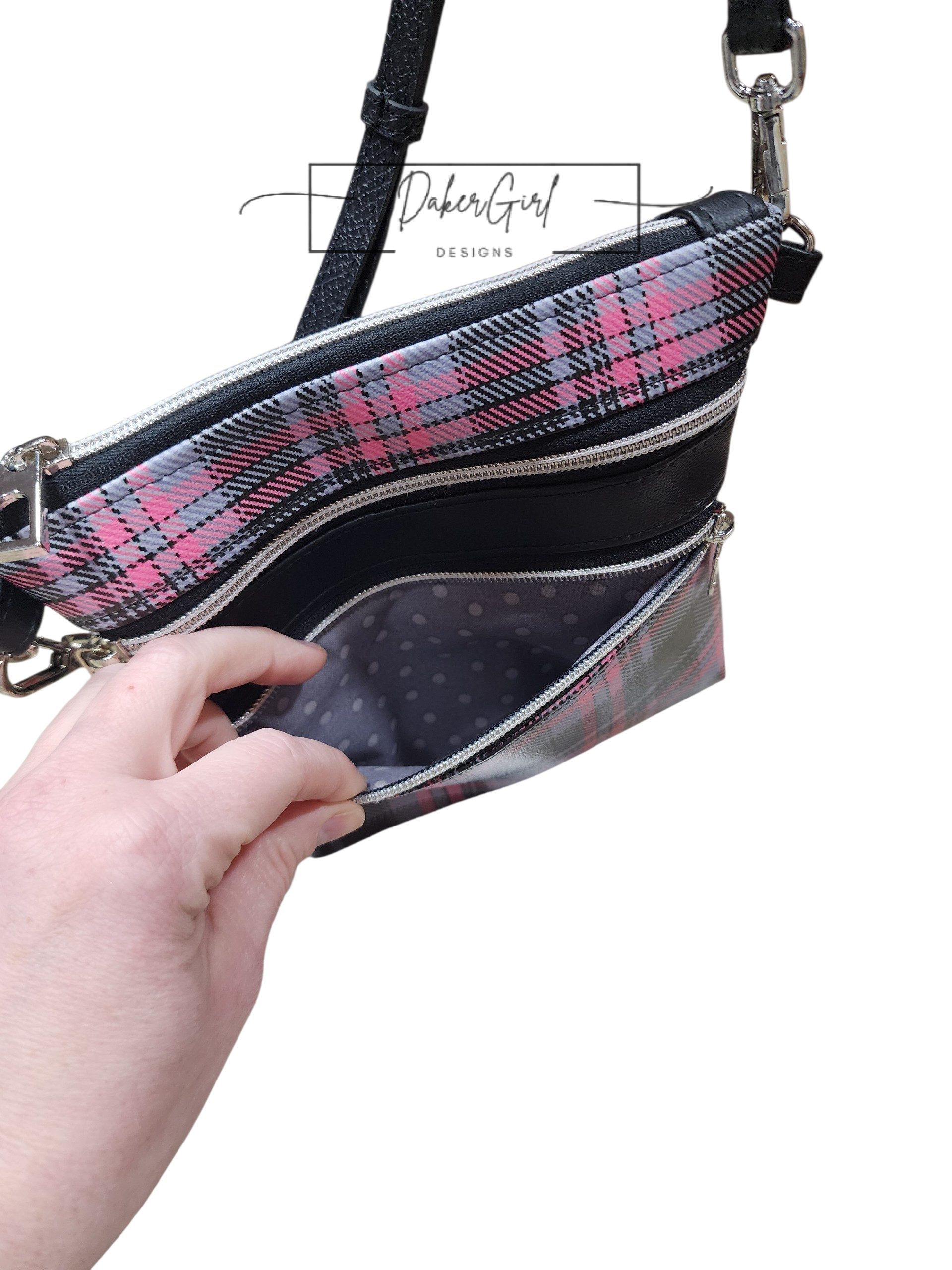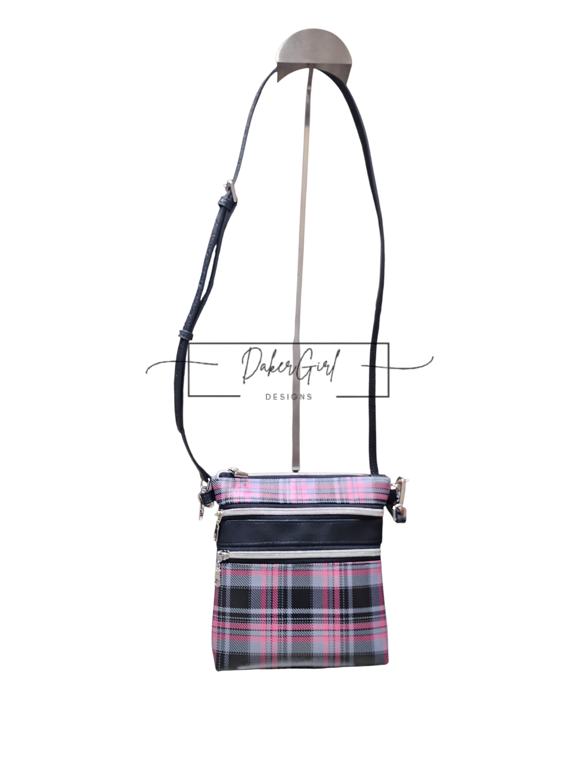 Stay organized in style with this sleek and functional handmade vinyl crossbody bag! Featuring a bold black, gray, and pink plaid design, this bag is perfect for everyday errands, travel, or hands-free convenience.