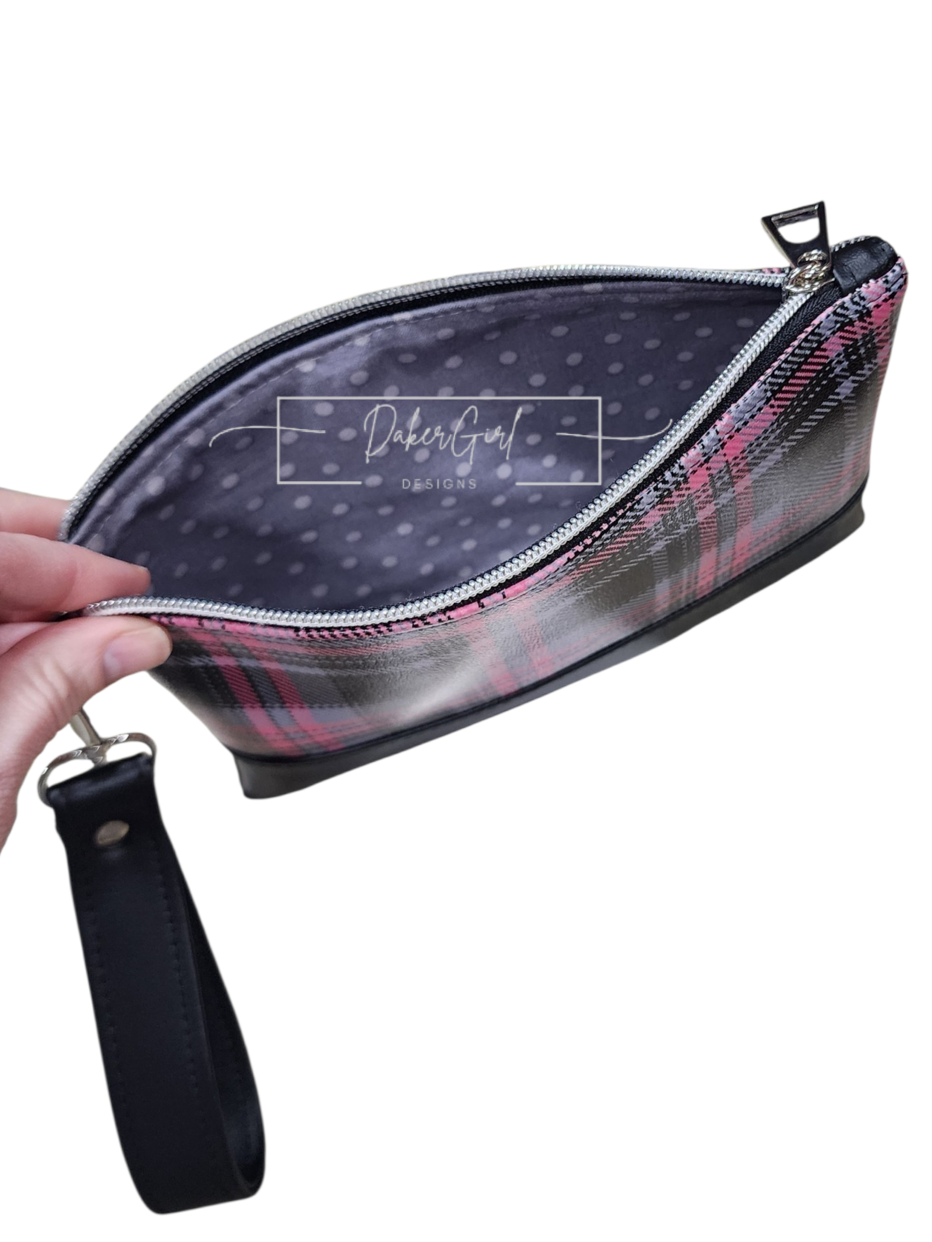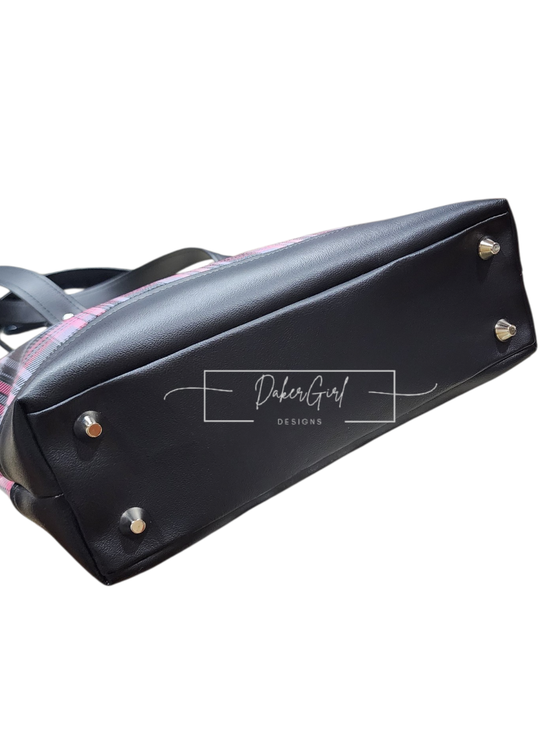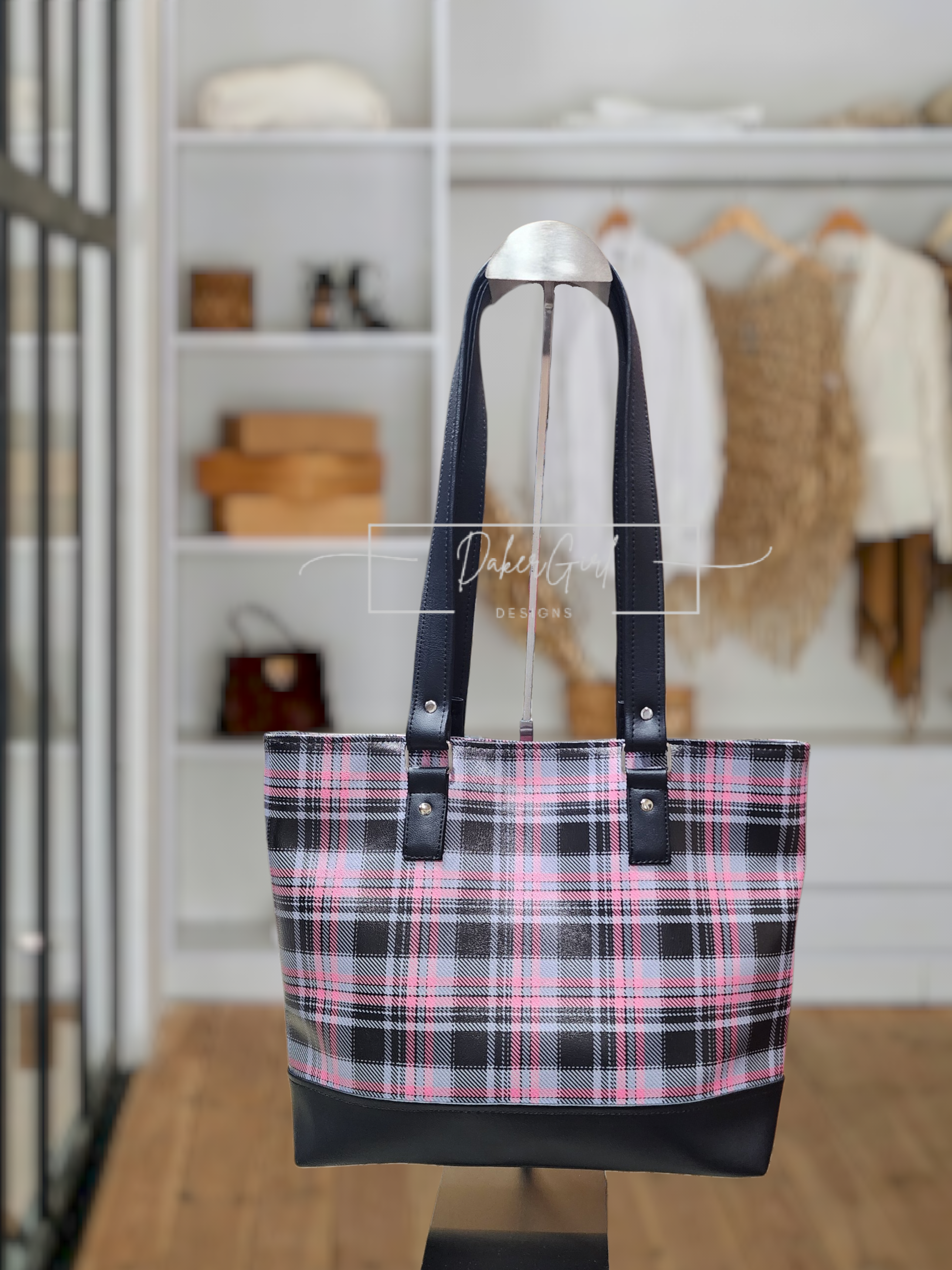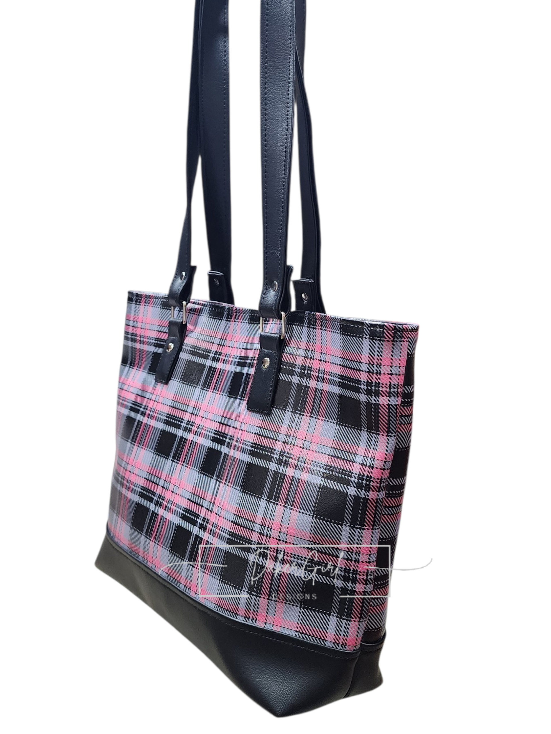 Stay organized in style with this sleek and functional handmade vinyl crossbody bag! Featuring a bold black, gray, and pink plaid design, this bag is perfect for everyday errands, travel, or hands-free convenience.