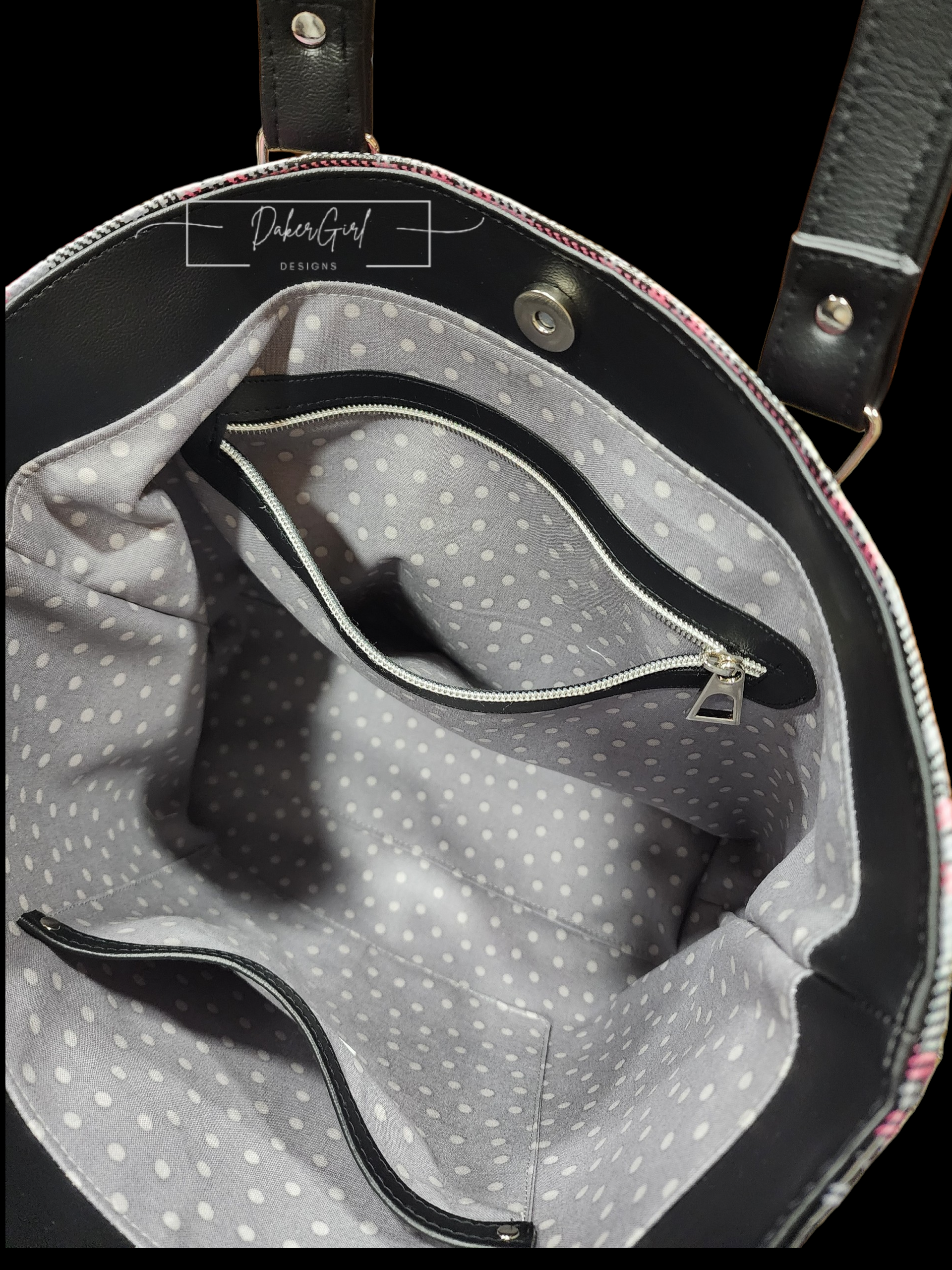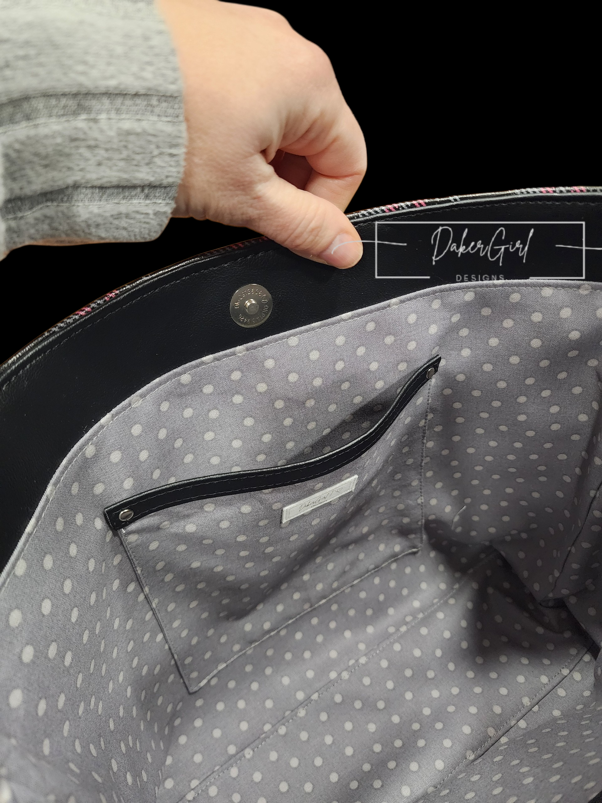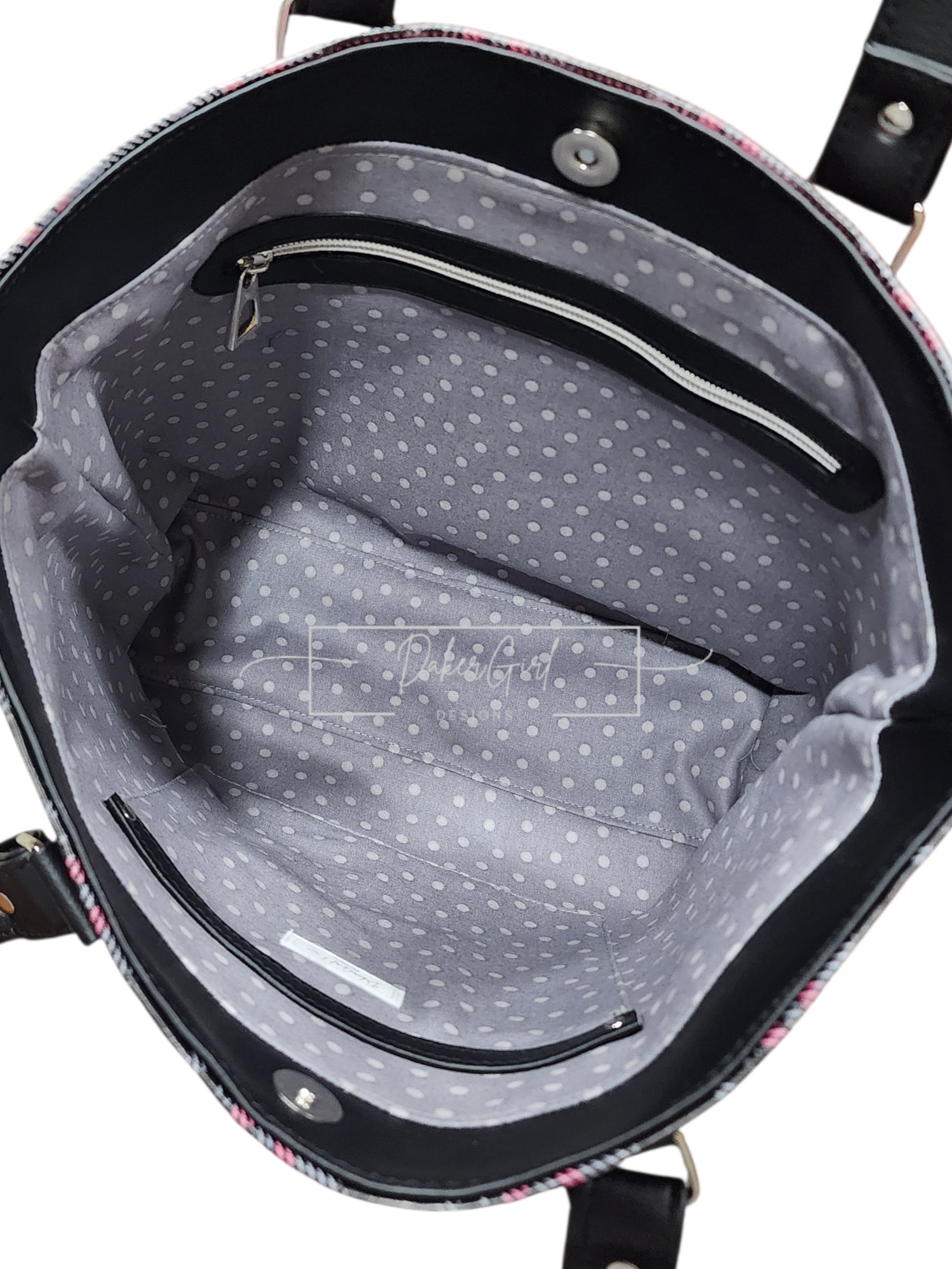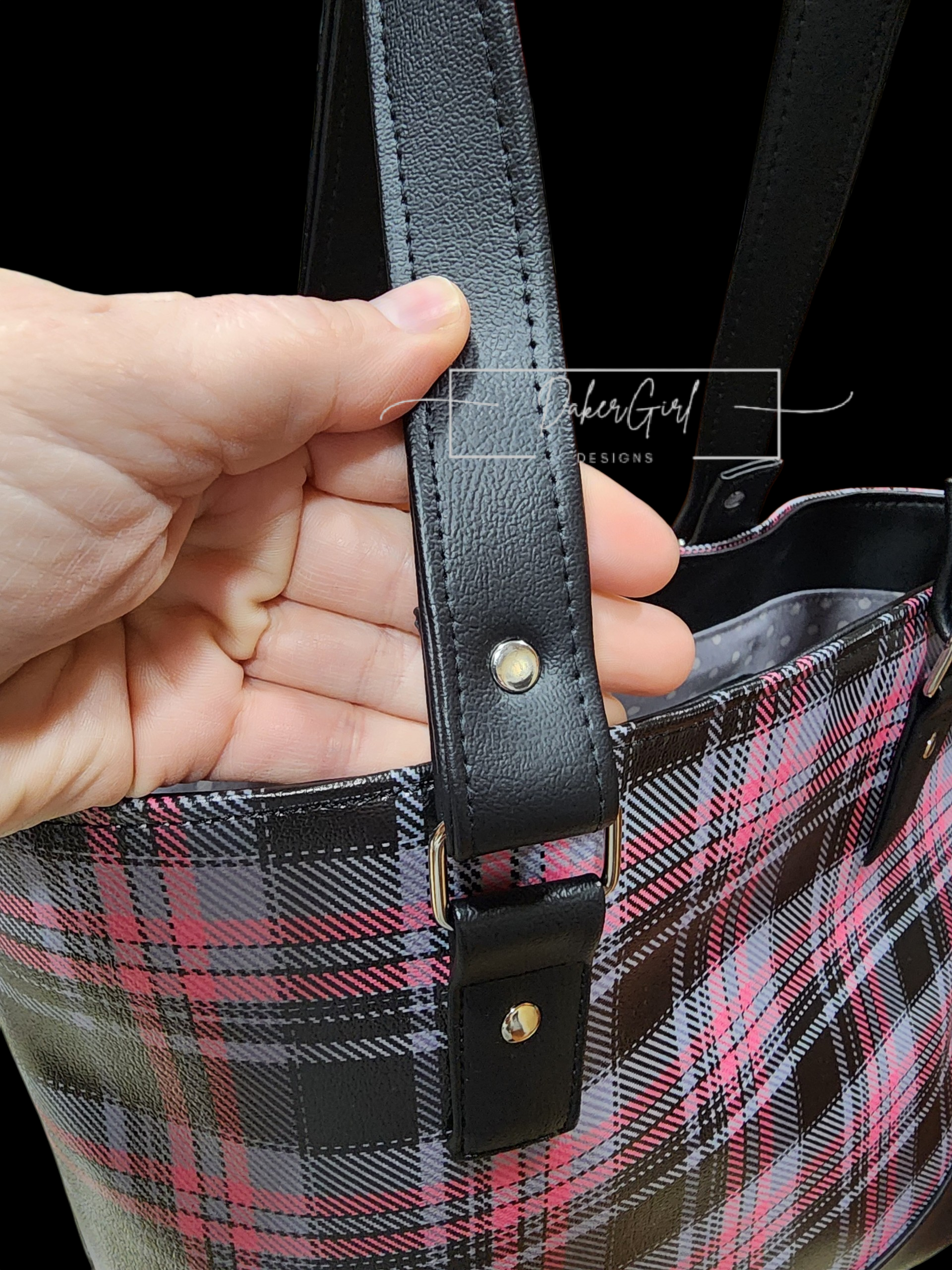 Stay organized in style with this sleek and functional handmade vinyl crossbody bag! Featuring a bold black, gray, and pink plaid design, this bag is perfect for everyday errands, travel, or hands-free convenience.